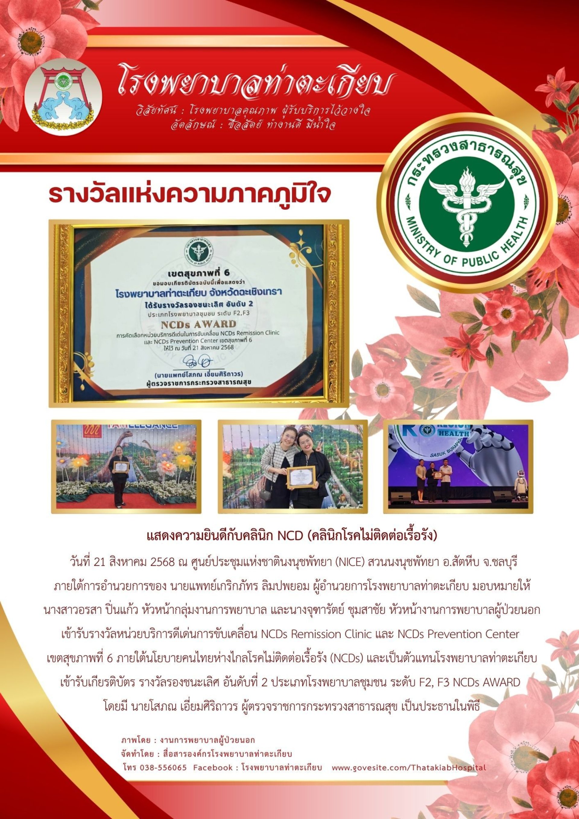 กลุ่มงานการพยาบาลโรงพยาบาลท่าตะเกียบ (NCD) รับมอบรางวัล NCDs Rememsion Clinic และ NCDs Prevention Center เขตสุขภาพที่ 6