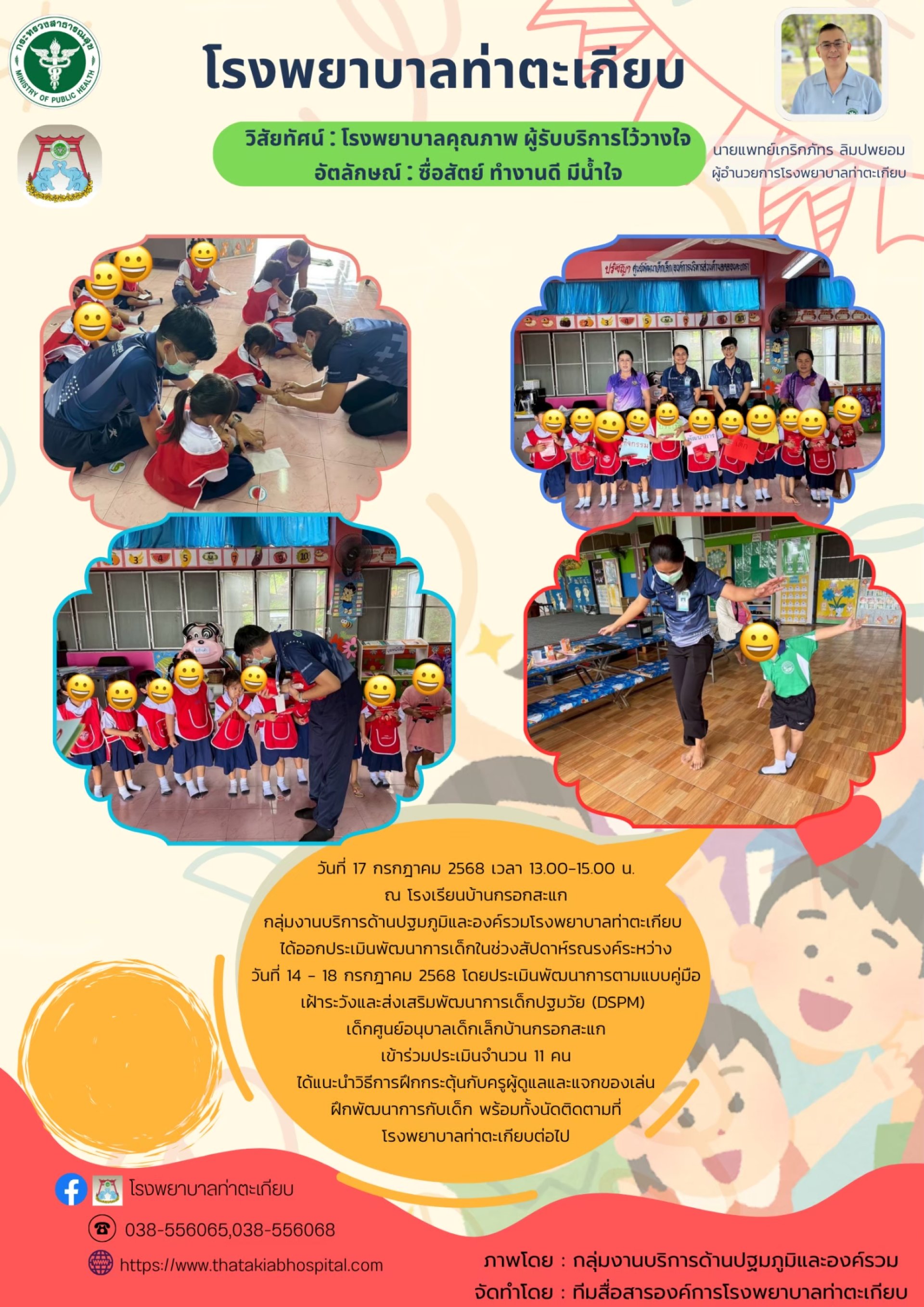 กลุ่มงานบริการด้านปฐมภูมิและองค์รวมโรงพยาบาลท่าตะเกียบ ได้ออกประเมินพัฒนาการเด็กในช่วงสัปดาห์รณรงค์