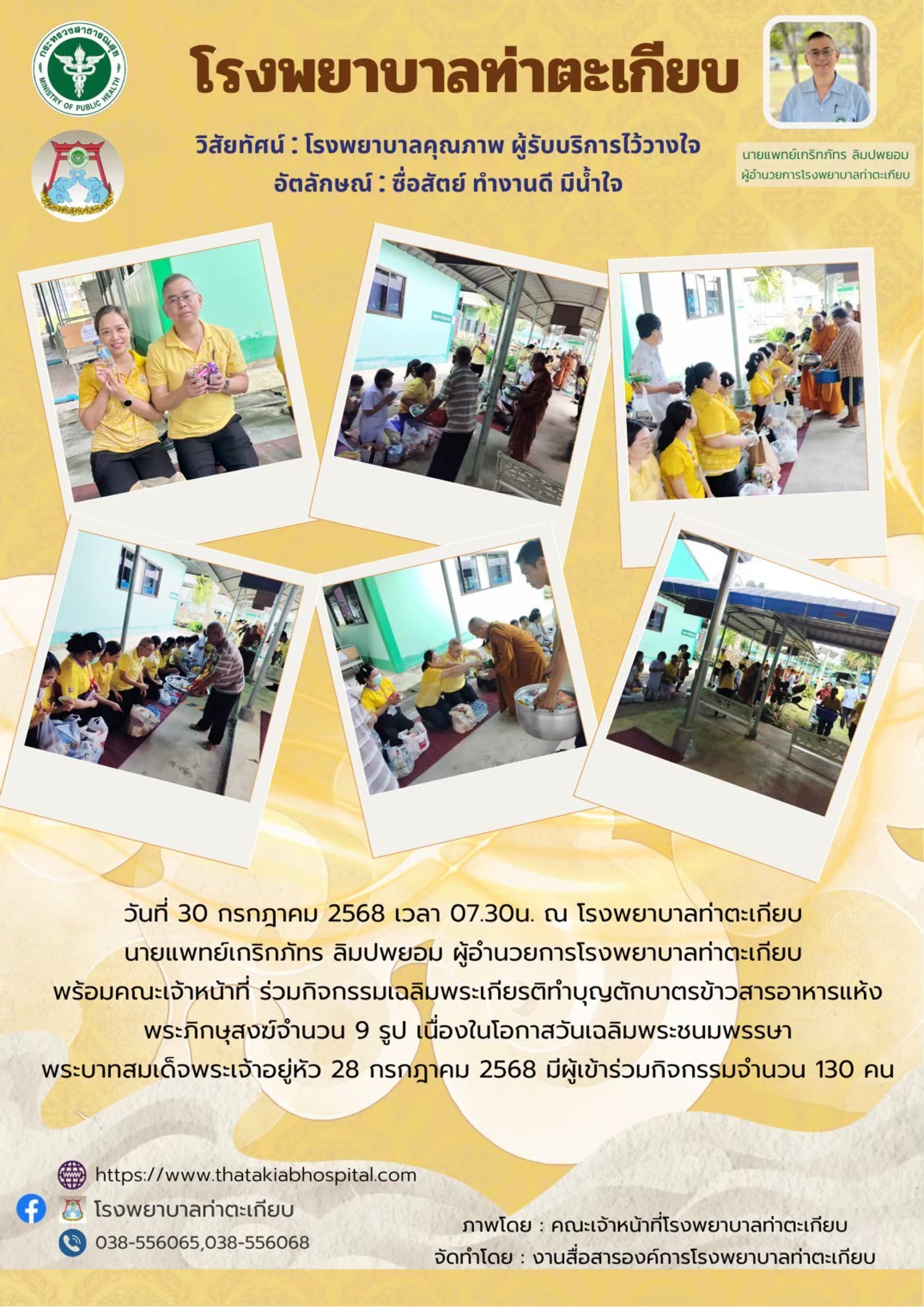 วันที่ 30 กรกฎาคม 2568 เวลา 07.30 น. ณ โรงพยาบาลท่าตะเกียบ นายแพทย์เกริกภัทร ลิมปพยอม ผู้อำนวยการโรงพยาบาลท่าตะเกียบ พร้อมคณะเจ้าหน้าที่ ร่วมกิจกรรมเฉลิมพระเกียรติทำบุญตักบาตรข้าวสารอาหารแห้ง พระภิกษุสงฆ์จำนวน 9 รูป เนื่องในโอกาสวันเฉลิมพระชนมพรรษา พระบาทสมเด็จพระเจ้าอยู่หัว 28 กรกฎาคม 2568 มีผู้เข้าร่วมกิจกรรมจำนวน 130 คน