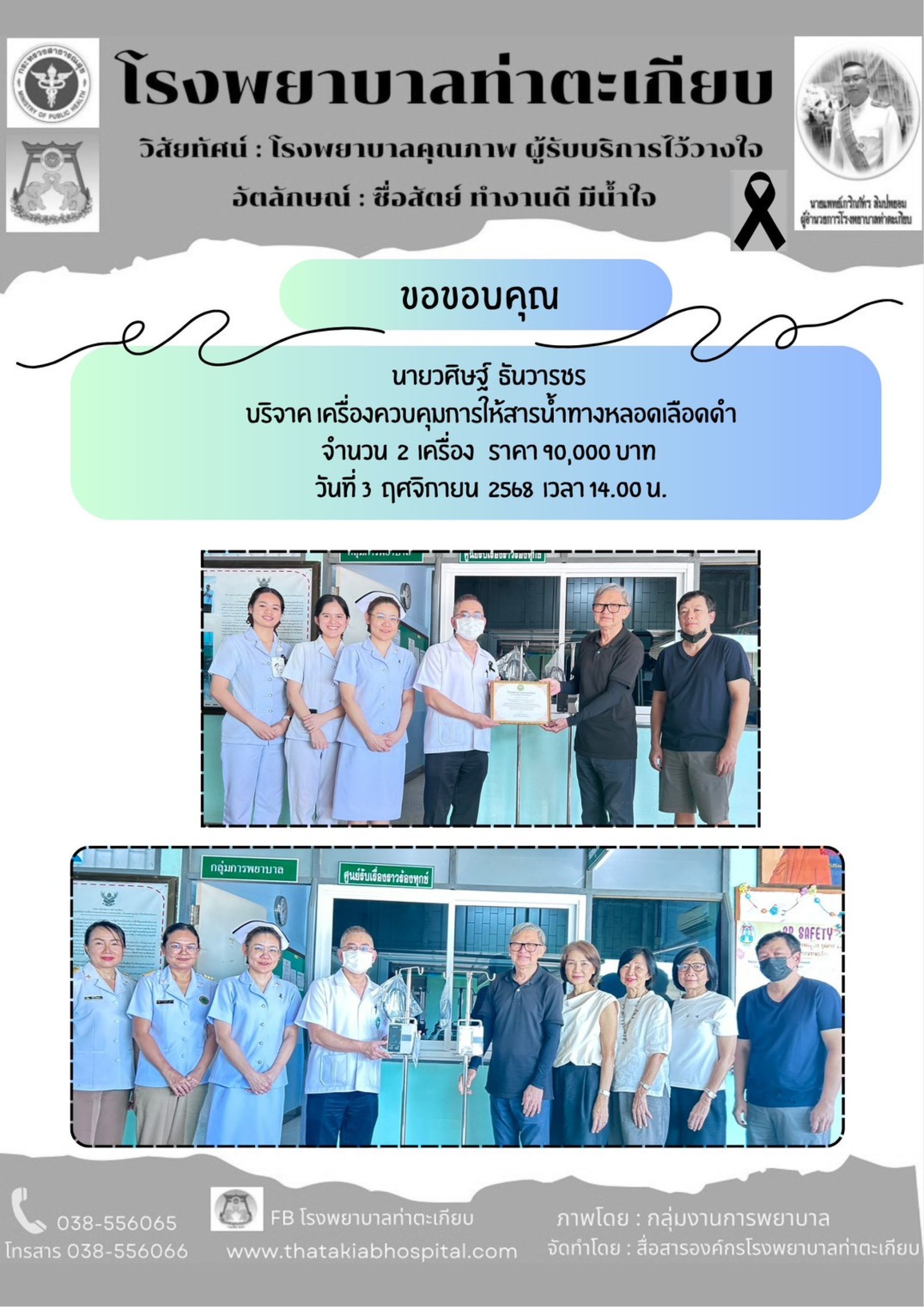 นายวศิษฐ์ ธันวารชร บริจาค เครื่องควบคุมการให้สารน้ำทางหลอดเลือดดำ จำนวน 2 เครื่อง ราคา 90,000 บาท ให้กับโรงพยาบาลท่าตะเกียบ