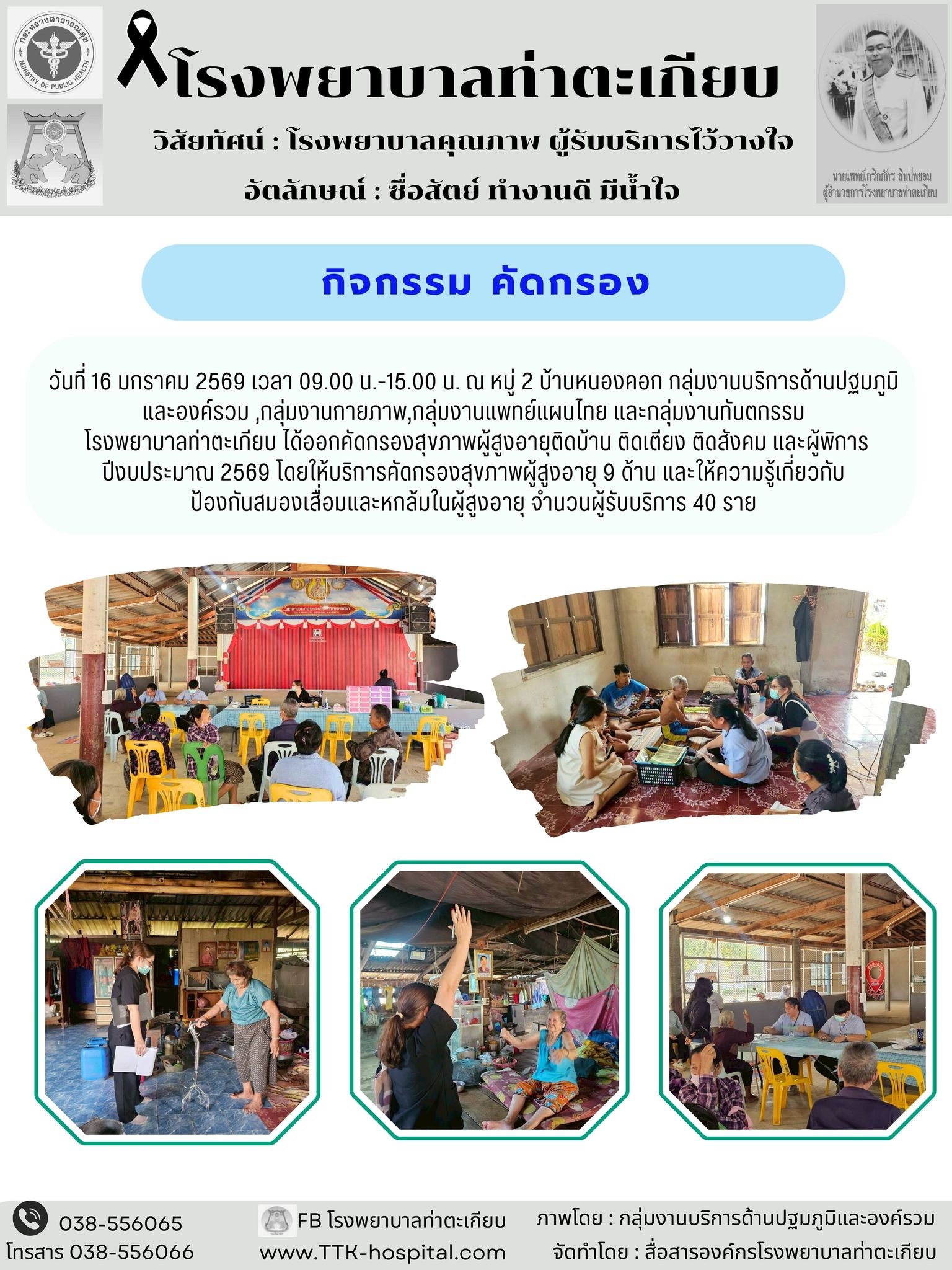 วันที่ 16 มกราคม 2569 เวลา 09.00 น.-15.00 น. ณ หมู่ 2 บ้านหนองคอก กลุ่มงานบริการด้านปฐมภูมิและองค์รวม ,กลุ่มงานกายภาพ,กลุ่มงานแพทย์แผนไทย และกลุ่มงานทันตกรรม โรงพยาบาลท่าตะเกียบ ได้ออกคัดกรองสุขภาพผู้สูงอายุติดบ้าน ติดเตียง ติดสังคม และผู้พิการ ปีงบประมาณ 2569 โดยให้บริการคัดกรองสุขภาพผู้สูงอายุ 9 ด้าน และให้ความรู้เกี่ยวกับ ป้องกันสมองเสื่อมและหกล้มในผู้สูงอายุ จำนวนผู้รับบริการ 40 ราย