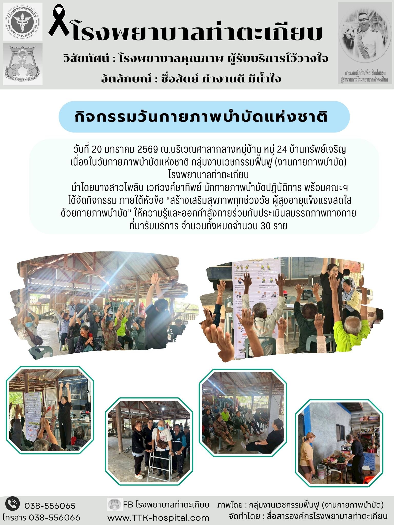 วันที่ 20 มกราคม 2569 ณ.บริเวณศาลากลางหมู่บ้าน หมู่ 24 บ้านทรัพย์เจริญ เนื่องในวันกายภาพบำบัดแห่งชาติ กลุ่มงานเวชกรรมฟื้นฟู (งานกายภาพบำบัด) โรงพยาบาลท่าตะเกียบ นำโดยนางสาวไพลิน เวศวงศ์ษาทิพย์ นักกายภาพบำบัดปฏิบัติการ พร้อมคณะฯ ได้จัดกิจกรรม ภายใต้หัวข้อ “สร้างเสริมสุขภาพทุกช่วงวัย ผู้สูงอายุแข็งแรงสดใส ด้วยกายภาพบำบัด” ให้ความรู้และออกกำลังกายร่วมกับประเมินสมรรถภาพทางกาย ที่มารับบริการ จำนวนทั้งหมดจำนวน 30 ราย