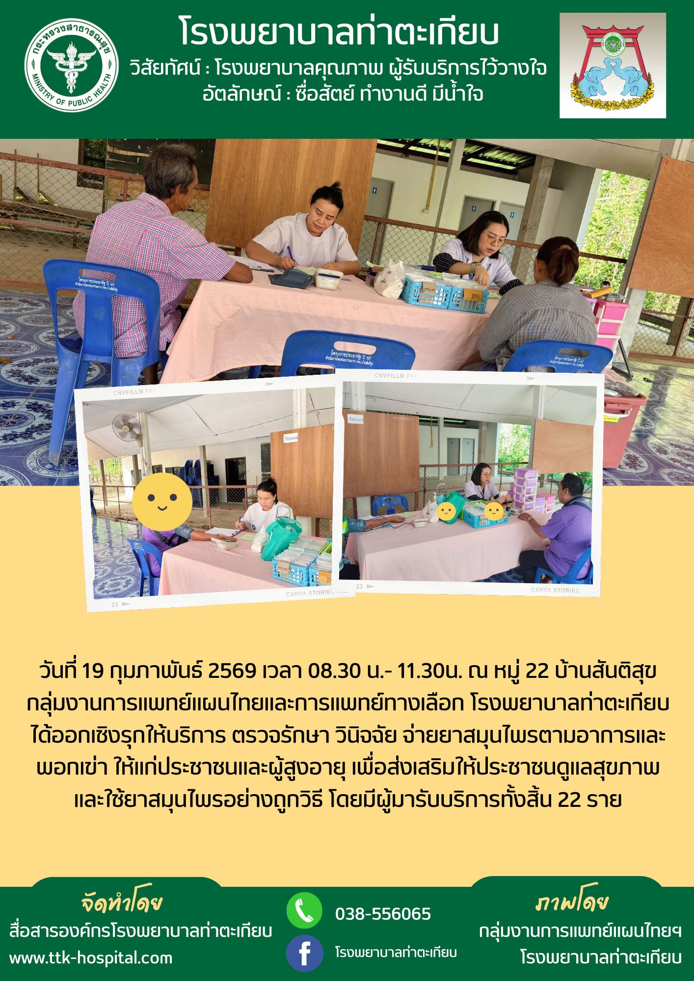 กลุ่มงานการแพทย์แผนไทยและการแพทย์ทางเลือก โรงพยาบาลท่าตะเกียบ ได้ออกเชิงรุกให้บริการ ตรวจรักษา วินิจฉัย จ่ายยาสมุนไพรตามอาการและพอกเข่า ให้แก่ประชาชนและผู้สูงอายุ